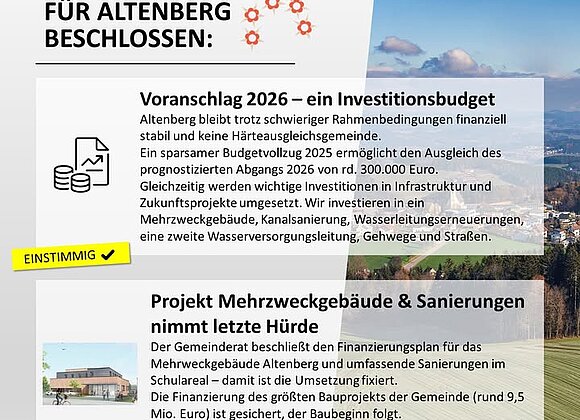 In der heutigen Gemeinderatssitzung wurden wegweisende Entscheidungen getroffen: 💪 Trotz herausfordernder Zeiten bleibt Altenberg finanziell stabil. 📊…